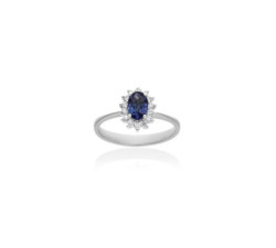 Anillo de Oro blanco de primera ley (750/1000) con 14 diamantes de peso total 0,17 qt. (Color: Top Wesselton (G) Pureza: SI) y 1 zafiro azul...