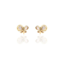 Pendientes de oro amarillo de 18 k,con forma de mariposa y nácar.Cierre tuerca de rosca