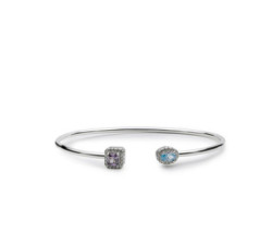 Pulsera rígida abierta de plata con circonitas en tonos lila y azul,rodeadas de microcirconitas. Un diseño elegante y versátil para combinar sola o...